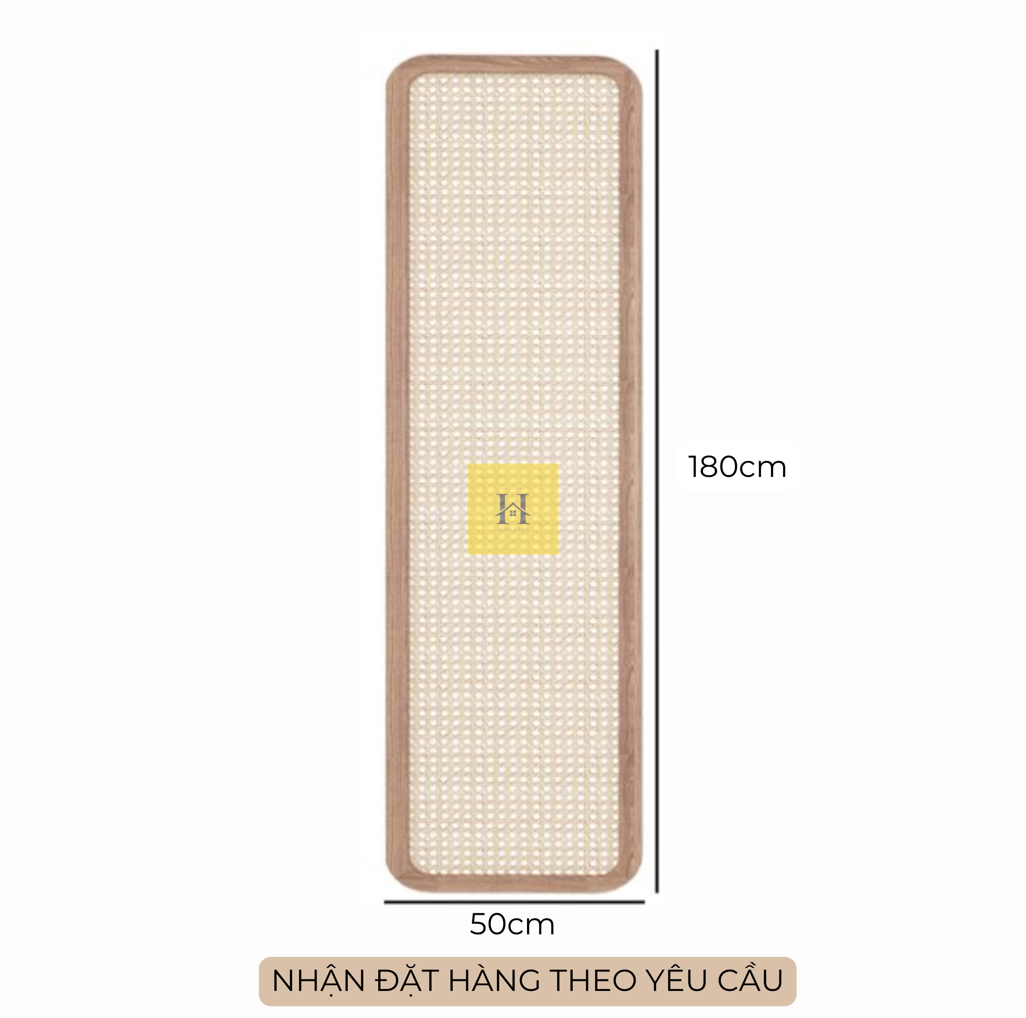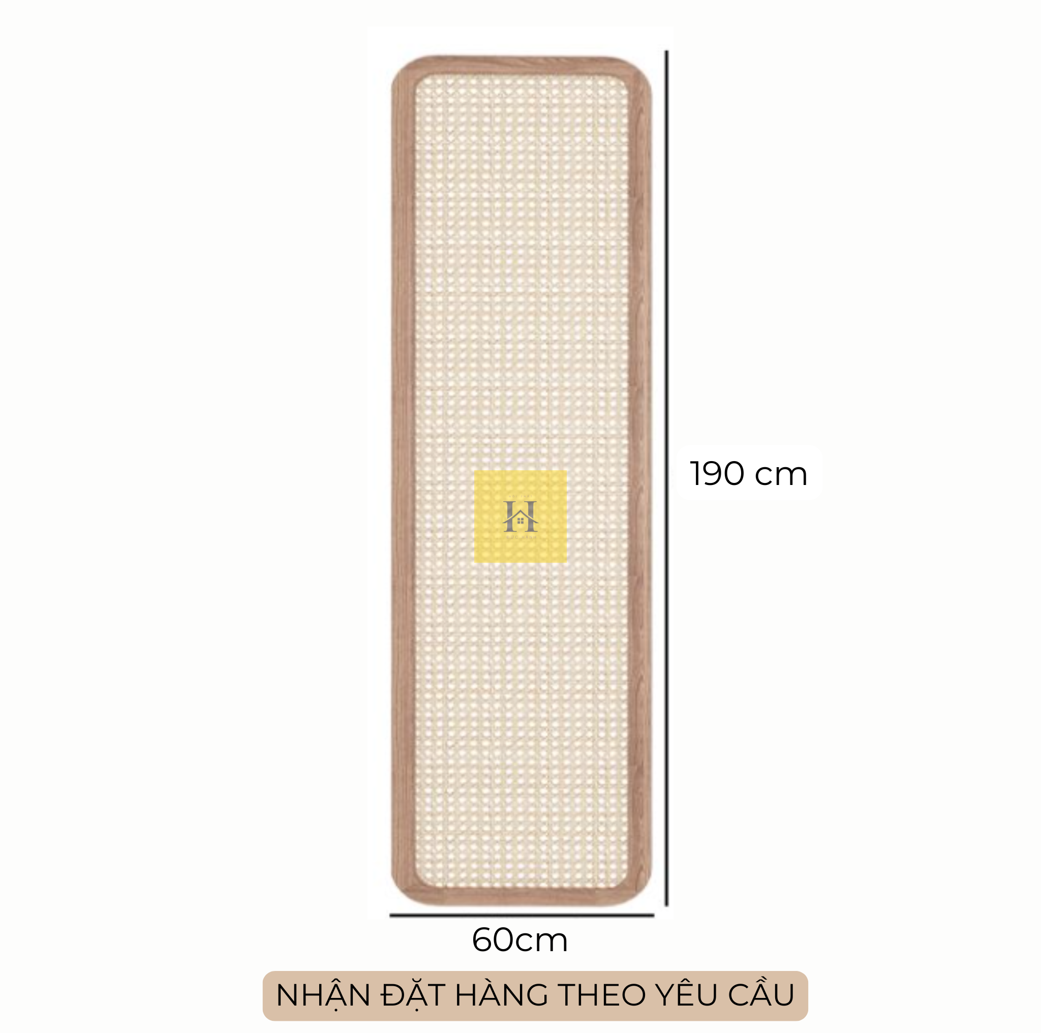 Vách ngăn kèm kệ phối mây (có chân) được thiết kế theo phong cách hiện đại pha mộc tự nhiên, phù hợp với xu hướng nội thất xanh và tối giản.